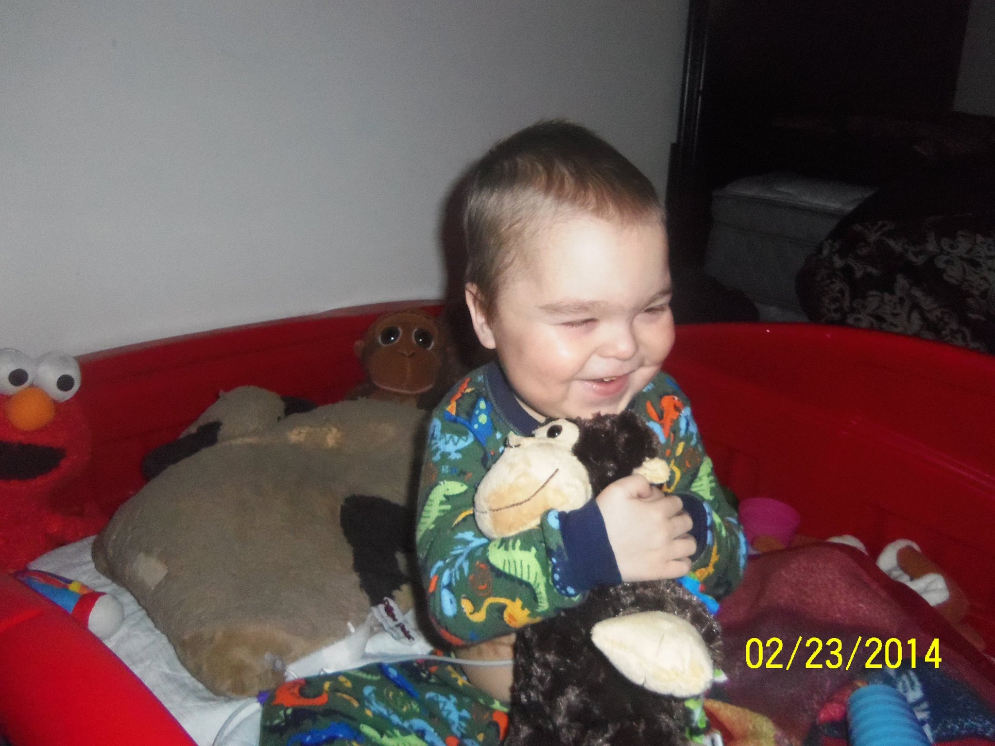 Damien arrived at 36 weeks via an induction and was whisked off to the NICU without my ever seeing him, holding him or kissing him to be seen by a variety of specialists. What seemed like an eternity later I was told he looked “great” but was being transferred to another hospital that is better equipped to handle special needs kids. He came home a month later with WORKING KIDNEYS, but in need of an NG tube in his nose as he would not eat by mouth. The dr said to expect his kidneys to gradually fail and be in need of dialysis by 8-10 years of age. Well, they failed at just 4 months due to what we now know to be a wrong initial diagnosis. We discovered through genetic testing that Damien actually suffers from a much worse and far rarer kidney disease known as Nephronopthisis 3. This led to kidney failure, liver failure, severe developmental delays, poor muscle tone, an inability to eat by mouth, bone deformities and heart trouble. At 5 years old he is not potty trained, has never stood up and does not crawl or walk.