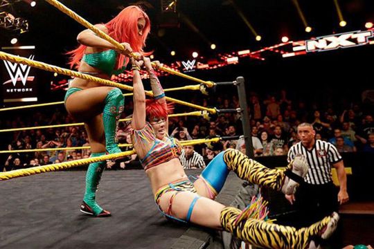 Now back to Eva Marie. While Asuka hasn’t technically lost a match in WWE, let me just take you on a history lesson back to the NXT women’s battle royal to determine a #1 contender at the beginning of January 2016. Asuka eliminated Billie Kay and Peyton Royce and appeared to be the last woman standing… but then Eva Marie ran in and eliminated her.